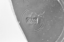 | Description: | Part of the bottom of a Western Sigillata dish. Rays lightly impressed beneath. Ring foot with angular profile. In center: <graphic> | |