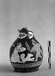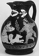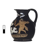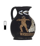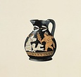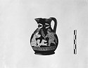 | Description: | Most of trefoil mouth and handle broken away. Ring foot. In the center, a female figure running right, carrying a cake (or cushion?); also running right, a fluffy-tailed dog. On either side, a boy; he to the left carrying a cake, he to the right a laurel branch. Laurel wreath around neck; egg pattern below scene. The girl wears an embroidered long-sleeved jacket over a thin chiton; the boys are nude; the boy on the left has an amulet band over his right shoulder; the one on the right a scarf flying from his right arm. Both wear fillets with white feathers(?). No relief contours. Firm white for girl's dress, flesh and package(?); for the dog, for the feathers of the boys' headdresses, and for the leaves of the wreath. Added clay, with traces of gilding preserved, for the fillets, a dot on the top of the package, and the berries of the wreath. Details over the white added in brown glaze. | |