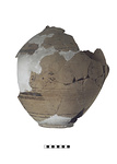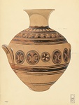 | Description: | Missing from base of neck upwards, and handles and a good part of one side. Much battered before it was buried. A hole in the bottom apparently deliberately cut. At the base of the neck, diminishing chevrons; below, on the shoulder, set off by a broad and two narrow bands, a zone of hand-drawn semicircles with sizable solid centers, edged by dots. On the body, a zone of circles, double, in which is inscribed a Mycenaean shield motif, solid, the side spaces filled by semicircles like those above. One circle, next to the break on the more damaged side, is smaller than the others, and enclosed a cross instead of the usual shield. Below this zone, another broad band, set off by two narrow bands below, and two above. Above the foot, two more bands. Pink clay with grits; creamy slip; much peeled black glaze. | |