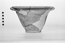 | Description: | Much missing from wall. Restored in plaster. Straight flaring side wall. Horizontal rim. Handles pressed close to rim. Thin brown glaze on inside only. | |