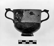 | Description: | One handle and fragments of wall missing. Restored in plaster. Cylindrical type. Low base ring. Strap handles spurred with masks. Around upper wall, an ivy wreath. Black glaze much flaked. | |