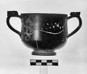 | Description: | Restored in plaster. Clylindrical type. Low base ring. Strap handles spurred with masks. Around upper wall, a double ivy wreath and above it: <graphic> | |