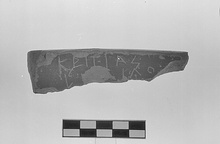 | Description: | From the rim of a semi-glazed krater; red glaze inside only; top of rim and outside unglazed. Incised inside: <graphic> | |