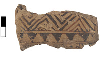 | Description: | One end of a hollow rectangular clay object; altar(?), fenestrated handle of large vase(?). Broken on all sides; one wall pierced. Tooth pattern and zigzag with diminishing triangles, and hook spirals in black glaze. Attic clay. | |