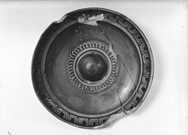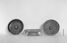 | Description: | Mended from four fragments; chips missing from lip and a small piece from one side. Careless ovolo band around lip and boss inside. Outside, save for hollow of boss, and inside boss and band between decorated surfaces, covered with thin grayish-black glaze, mottled with red; better on outside. Attic clay. Thin fabric. | |