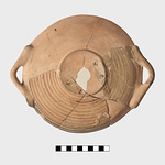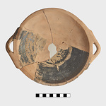 | Description: | Low base and shallow body; handles set at rim. One handle and much of wall missing, restored in plaster. Inside glazed; on rim, stroke series; on body outside, bands; on bottom vier-blatt with swastika between the leaves. Glaze red to bluish, and somewhat peeled. | |