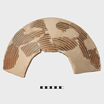 | Description: | Large convex amphora lid, about one-third preserved and filled out in plaster. None of the handle. Shallow flange underneath near edge. Glaze bands on the top. Black to brownish glaze. | |