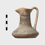 | Description: | Mouth, most of handle, and most of bottom missing. Restored in plaster. Concave bottom; squat body, lower and upper parts meeting at sharp angle; narrow upward-tapering neck. On body, bands; on neck, bands and linked dots; on handle, bars. Bluish glaze, somewhat peeled. | |