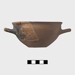 | Description: | One handle preserved, with part of wall and rim; largely restored in plaster. Shallow body, very open with sharply flaring wall and slightly flaring narrow rim. Glazed inside and out; reserved band outside rim, and another with bar series on top of rim. Black to red glaze, somewhat peeled. | |