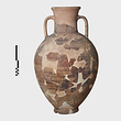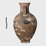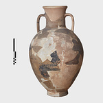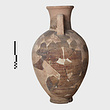 Nearly vertical ring foot and strap handles. Reserved circles, one on each side of neck, quadrisected into four-spoked wheels; a dot rosette between each spoke.