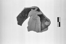 Description:   Part of a draped youth right, with a sponge-bag hanging by relief-line strings. No contours.