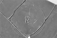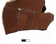 | Description: | Most of base of a large flat Samian A dish or plate. Low carefully moulded foot ring. Inside in center, a stamped rosette surrounded by four concentric grooves; two close together, then two more widely spaced. Pinkish-orange clay, very micaceous; hard, glossy orange-red glaze inside and out. | |