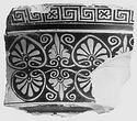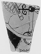 | Description: | From a sizable open vase, glazed inside, rather dull. a) At left a warrior whose cuirass flaps hang over a shaded body; his sword sheath projects to the right. The inside of the shield of another warrior, decorated with volutes (?). b) From neck and rim. On the neck, double palmette and 'lotus' chain; on the vertical face of the lip, maeander with saltire squares. Top of lip reserved. This fragment, taken from the uninventoried sherds from the marble chips pit (box 238), is associated with the body fragment on the basis of fabric and glaze. ADDENDA a) Description wrong here; see publications. P 14969 possibly belongs to the same vase. | |