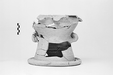 | Description: | Fragments missing from rim, including three supports for pot. Moulded base, down-turned rim. Four holes in basin mended with lead. Horizontal close handles. Coarse red clay with paler slip. ADDENDA A dim stamp on underside? Cf. P 683. | |