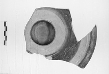 Description:   Fragment from one side of a plate with slightly curved down-turned rim. A groove and a broad reserved band below rim and around central hole. Underside of rim reserved, and resting surface.