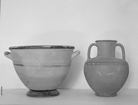 | Description: | Part of one side missing. Ring foot; round belly; rolled rim; double rolled handles. Reddish glaze wash inside and out; black glaze inside the neck, on the rim and for two bands around the shoulder, below handle attachments. | |
