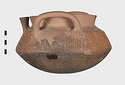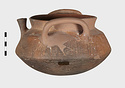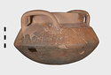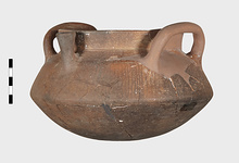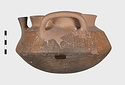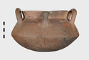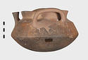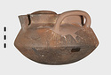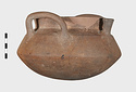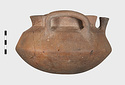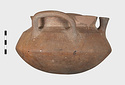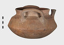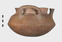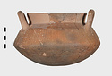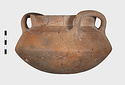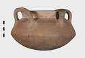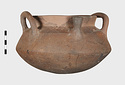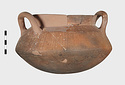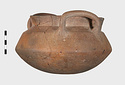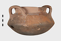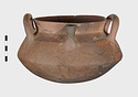 | Description: | One handle, part of lip and small fragments from wall missing. A round-bottomed pot with sharp angle at shoulder and high flaring lip, flanged inside; two horizontal loop handles, rising vertically from the shoulder; short false spout. Thin micaceous red clay with shallow vertical grooves on upper half. | |