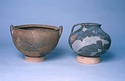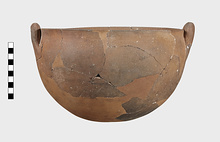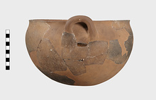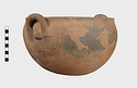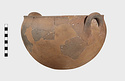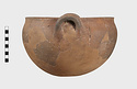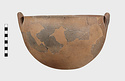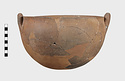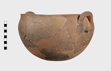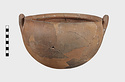 | Description: | Much of walls, part of rim and most of one handle missing; restored in plaster. Round-bottomed pot, little more than hemispherical in shape, with very slightly flaring lip, flanged inside. Vertical rolled loop handles projecting above the rim and set close in beside it. Fabric as P 8875 (Γ 2312); burned outside. ADDENDA P 8875: Similar in shape and fabric to P 8874 (Γ 2311). P 8874: Coarse gritty clay. | |