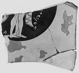 | Description: | Joins P 7690. Wall fragment of thin fabric with slight horizontal curve. Inside unglazed, but carefully polished. Possibly from a cup? Outside, a pair of nude male legs moving right. Behind them a folding stool on which is drapery, one end hanging down. Careful relief contours. Inner drawing on the legs in dilute glaze. | |