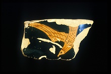 | Description: | Reserved band inside. Outside, an eagle flying down to left. Relief contours, except for the upper edge of the wing. Details in relief lines and dilute glaze. Excellent glaze. | |