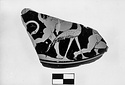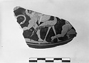 | Description: | From the shoulder of an hydria. Plain band below figured zone. Battle of pygmies and cranes: both move right, alternating. The pygmies are nude; one on the left carries a shield and spear(?), one on the right falls forward. Relief contours, save for the hilly ground beneath the standing figure, and for the left foot of the falling figure. The outline of the shield incised with a compass. Scanty dilute glaze inner drawing; dilute glaze dots on the crane's wing. | |