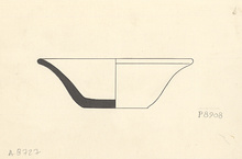 | Description: | Full profile and diameter preserved; fragments of rim and sides missing. Shallow bowl with outcurving rim and flat bottom, left rough. Very gritty red-brown clay. Unglazed. | |