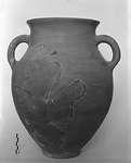 | Description: | Most of one side and base preserved, mended from many fragments; the other side, the neck and one handle restored in plaster. Reddish-brown micaceous clay. Household jar. | |