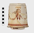 White slip, dull but firm, on outside. Decoration painted in glaze, orange to brown: wide and narrow bands at top and bottom of sides; knotted ribbons in the field.