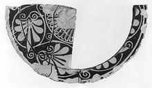 | Description: | Two fragments, one preserving about one-quarter of the lid, the other part of the edge only. Knob broken away. Edge chipped. Lid slightly convex on top, with overhanging edge set at an acute angle to the top. Decoration on the vertical face of the edge: maeander broken by cross-squares. On the top: large slanting palmettes with enclosing tendrils. Around the knob: tongues. Underneath: the edge reserved; inside glazed, then reserved with two glaze rings. Relief contours for the palmette pattern. Careful work. | |