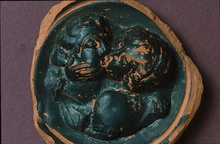 | Description: | From the center of a medallion plate, fine concentric grooves on the outside. Inside, in high relief, Eros and Psyche kissing, the lady on the right. Cf. Pagenstecher, Exp. E. von Seglin, II, 3, p. 58, fig. 69, satyr and maenad? | |