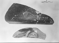 | Description: | Two fragments, not from the same pot. Deepish bowl with inturned rim, slightly thickened upward. On a), the wall is pierced near the rim, and a short open spout added. b) is a rim and wall fragment. Attic clay. Glaze black to red on rim and inside and somewhat peeled. The clay of a) more buff and the glaze more peeled than on b). | |