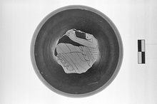 | Description: | Complete circle of base, short thick stem with moulded ring and part of interior medallion preserved. Restored in plaster. A woman, left, reclining and playing flute; drapery thrown across her legs. Missing are: her head, shoulders and back, her legs below the knees, the couch on which she is reclining and most of the flute. Fine relief contours. Dilute glaze for inner drawing of arm. | |