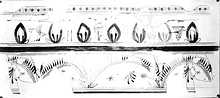 White slip. Decoration in matte orange to red; on the flare, a bead and reel; on the walls, bands, ribbon bows and a basin on a stand.