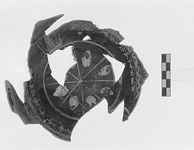 | Description: | Mended from many fragments; much missing. One small wall fragment does not join. A bowl similar in shape to the Megarian, but more spreading, and with the exterior covered with wheel-run grooves and ridges, the lowest of which forms a small low ring foot. Lip slightly out-turned. Decorated inside in white and clay color: on the floor, a double cross, large white petals between the arms, then a miltos groove. On the wall, above and below a white ribbon band, on one side vine, on the other ivy patterns; the division between the two marked by a large lyre. Miltos groove just below the lip. Buff clay; glaze somewhat peeled. | |