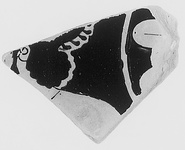 Description:   From wall of an open pot, probably a krater. Back part of head and shoulder of man facing left with elaborate hair-dressing and beard. At right segment of handle palmette(?).