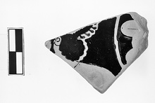 Pinkish-buff clay; good black glaze inside and out. Relief contour for shoulder and ornament. Hairline reserved.