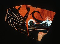 | Description: | Two joining fragments, broken all around. Interior black glazed. Torso of draped figure, right, with left arm raised from waist, standing in front of an altar. White for palmette and volutes on altar. Thinned glaze for fire rising from altar. | |