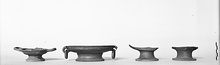 | Description: | Part of the floor and the cylindrical stem and flaring foot of an unglazed dish. A groove around the outer edge of the foot. Fine pinkish-buff clay; creamy slip. Unglazed. | |