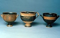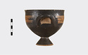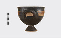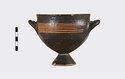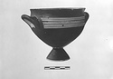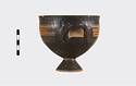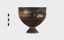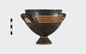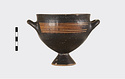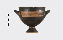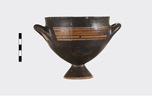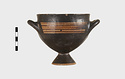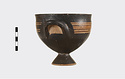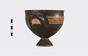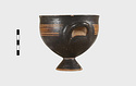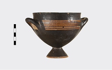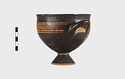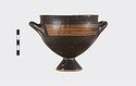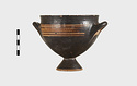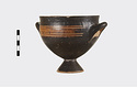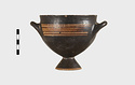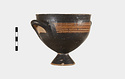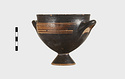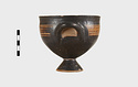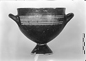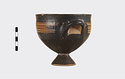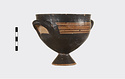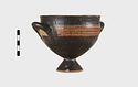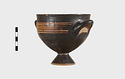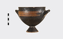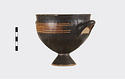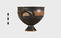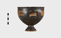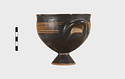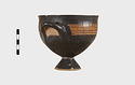 | Description: | Complete and intact, save a small fragment near one handle. A deep goblet with two slightly rising horizontal handles and small conical foot. Reserved are: the handle zone, which is decorated with a zigzag pattern and four horizontal bands; inside and between handles, a narrow line at inner edge of lip; the outer edge of the foot at the bottom, and its underside. Elsewhere, thick, rather metallic black glaze. | |