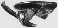 | Description: | Two fragments preserve part of the thickened out-turned rim and walls; none of the base. On either side two youths, one nude, his arms extended toward the other, who is cloaked. Palmettes under the handles. Ivy wreath painted in white and clay color inside rim. No relief contour. Another, very alike, in tray; cf. also the fragment of a kantharos with double-folded rim. | |