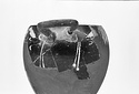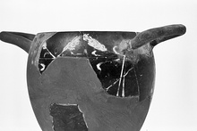 | Description: | The principal fragment preserves part of upper wall with slightly incurving lip and the stubs of a horizontal handle set just below lip. The stub of the other handle and bits of rim and wall also preserved. Restored in plaster. Decoration in thinned clay: below rim, heads of wheat and pendent ribbons with dots at bottom. Good black glaze. | |