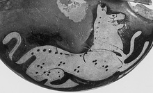 Description:   Shallow type. About half, including handle and spout, missing. Decorated with two spotted panthers, one fully preserved; head and tail only of other.