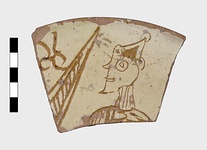 | Description: | From an open plate. A warrior, left, wearing a pointed cap, carrying a pointed wicker shield. Orange clay; yellow glaze. | |