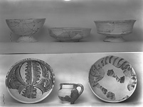 | Description: | A deep plate with almost vertical, slightly out-turned rim; low ring foot. Restored in plaster. In the center medallion, a bird against an imbricated background. Between the medallion and the rim one narrow and one wide band of zigzags. Fine sgraffito. Red clay, almost colorless glaze. Very thin white slip on outside. | |
