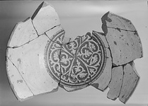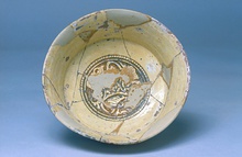 | Description: | An open bowl on a flaring foot. Almost flat floor, sharply defined junction between floor and vertical concave sides. In the cente, a medallion with a rinceau design against an incised background. Reddish clay, yellowish glaze. White slip and colorless glaze over entire outside. | |