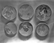 Description:   A flat plate with a ring foot; piecrust edge. About one-third preserved. Restored in plaster. In the center, a medallion with a geometric design against an imbricated background. The rest decorated with three bands of rinceaux; the two innermost debased, the outermost fairly fine, with imbricated background. The middle band was interrupted, probably four times by a geometric medallion.