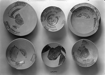 | Description: | A small fine sgraffito bowl. Restored in plaster. In the center, a medallion with a split palmette against an imbricated background. Around the sides, a band of rinceau and one of zigzags. Red clay, greenish-yellow glaze. White slip and colorless glaze over all of exterior. | |