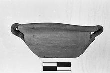 | Description: | Under surface rough, unfinished from the wheel; curving body; broad projecting rim, nearly flat; wide vertical band handles, carelessly attached. Pink clay; no glaze. Miniature Votive Bowl. Six complete bowls like this and fragments of about 200 more were found in this cistern. | |