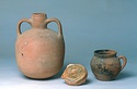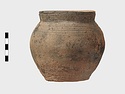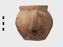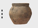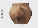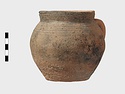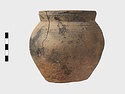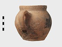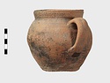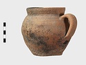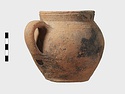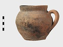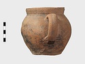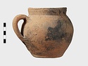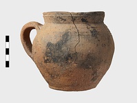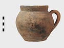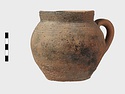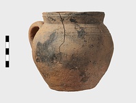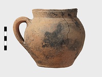| Description: | Cracked but whole. Flat bottom; roundish body; low nearly straight rim; single handle. Grooves on shoulder. Coarse reddish to brown clay. Unglazed. Blackened. | |