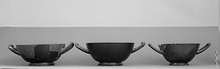 | Description: | Much of rim and one handle missing; restored in plaster. Moulded foot ring, concave above. Stamped decoration: on floor, rosette surrounded by linked palmettes joined by arcs. Good black glaze. Reserved center below, with glazed circles and dot; reserved narrow groove at base of wall. | |